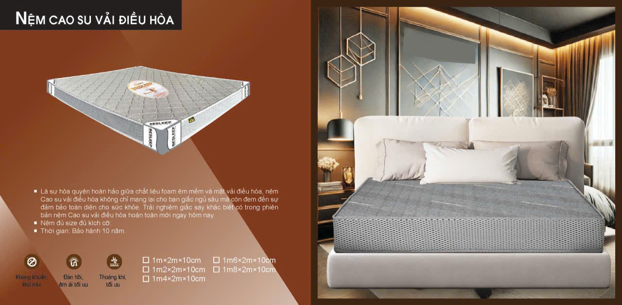 Nệm cao su tổng hợp được sản xuất từ nguyên liệu tổng hợp cao cấp theo dây chuyền công nghệ tiên tiến hiện đại với thiết kế bề mặt nệm êm ái, chịu lực tốt, nâng đỡ tối đa mang đến cảm giác êm ái đưa bạn vào giấc ngủ sâu và yên giấc.